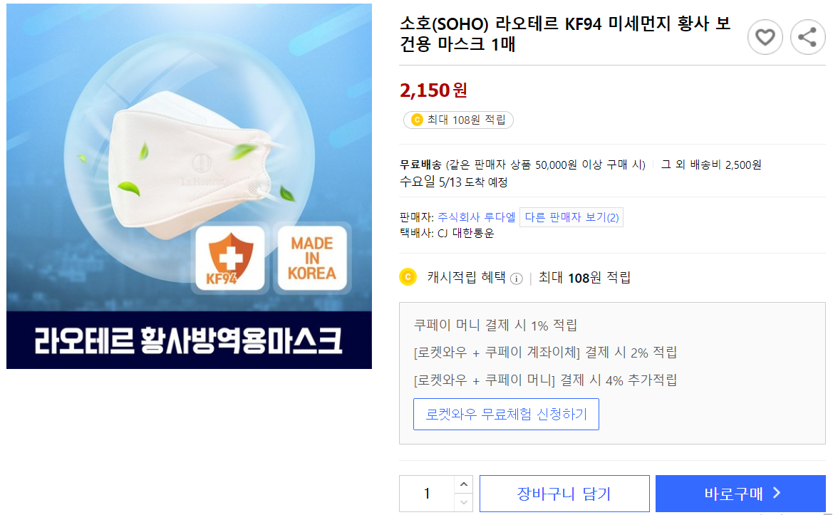 소개 해 드린 소호 라오테르 KF94 마스크는 장당 2,150원에 판매되고 있네요.