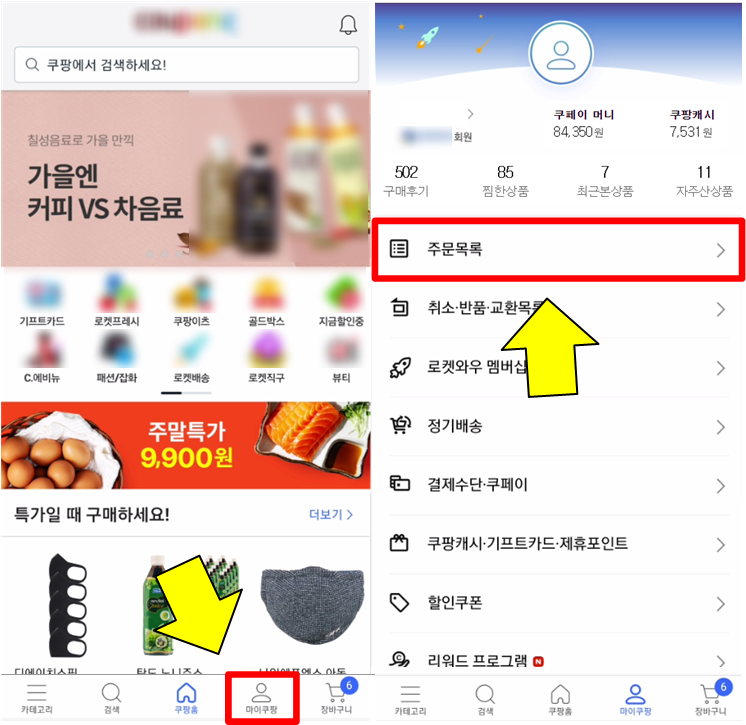[마이쿠팡 > 주문목록]으로 들어가주세요