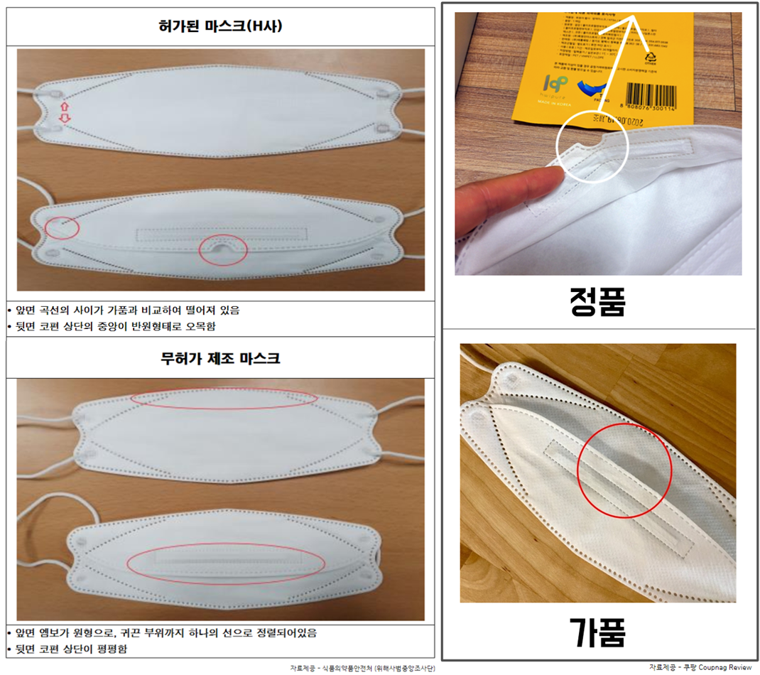 정품과 가품 구분은 마스크의 디자인을 보고 확인할 수 있습니다.